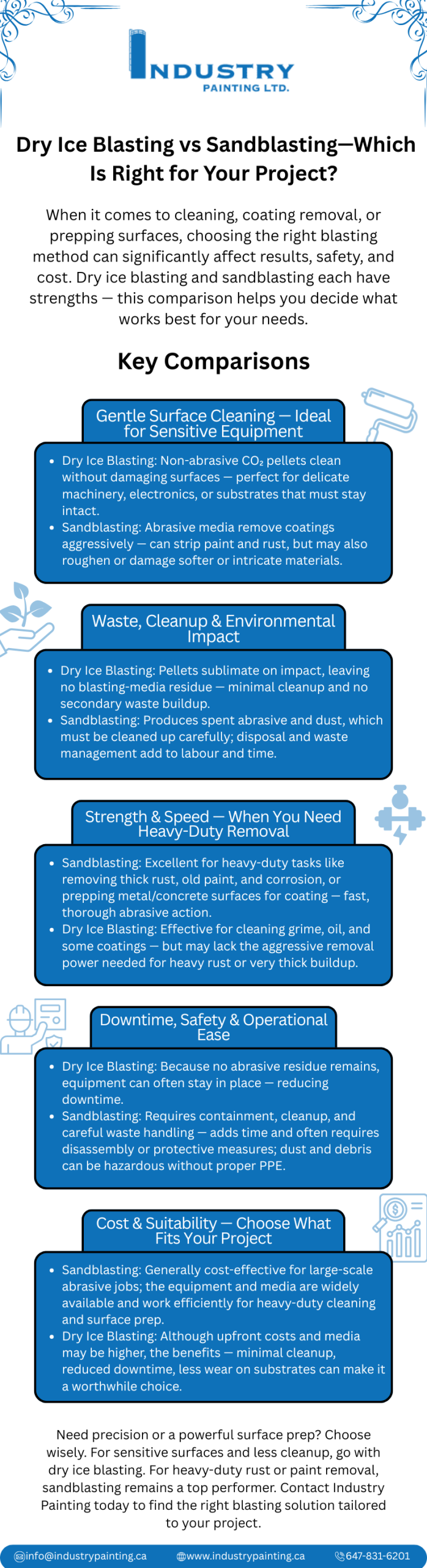 Choosing between dry ice blasting and sandblasting depends on your project needs. Compare cleaning strength, surface safety, cleanup, downtime, and cost to pick the right solution.